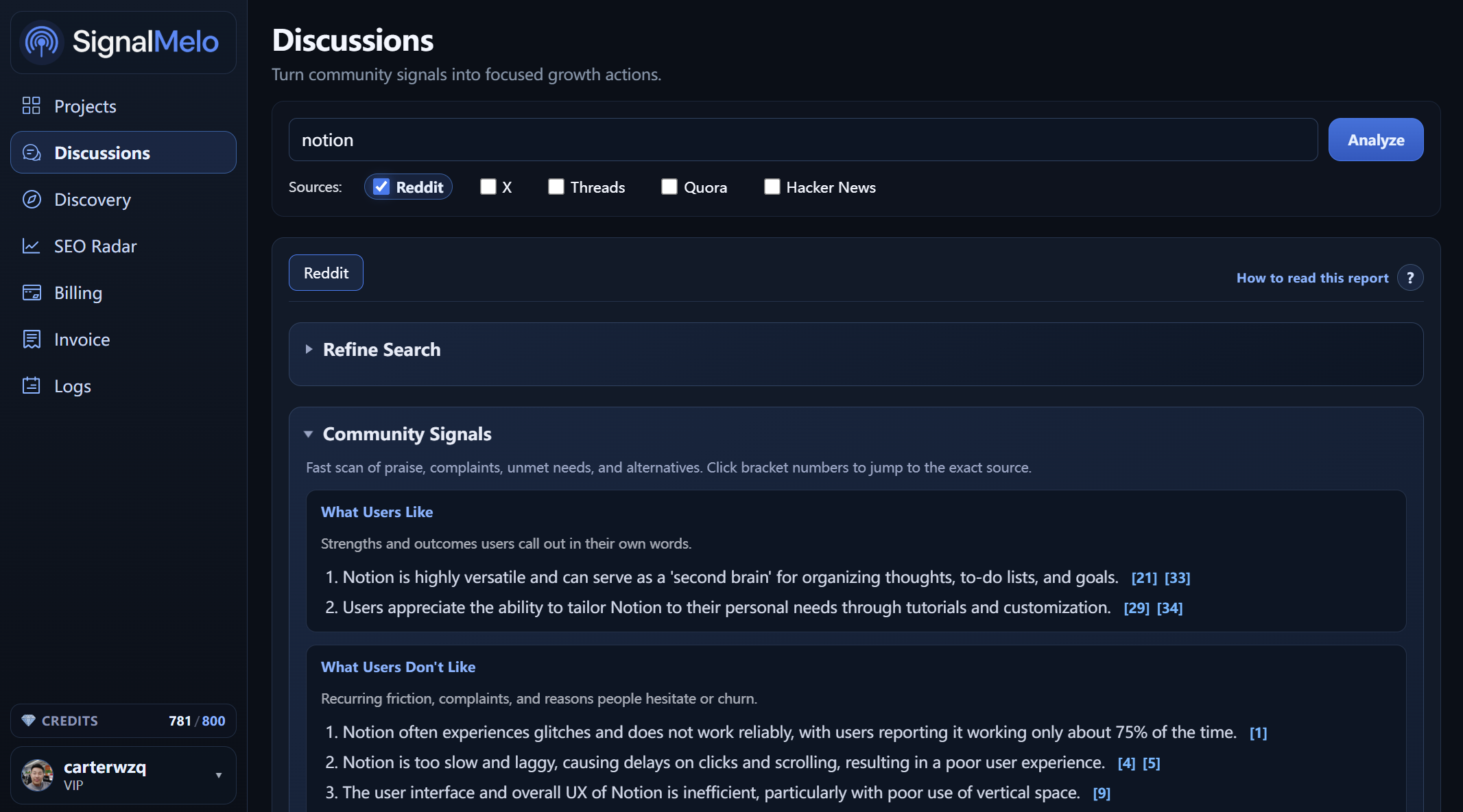 - Track intent-rich threads across Reddit, X, Threads, Quora, and Hacker News.